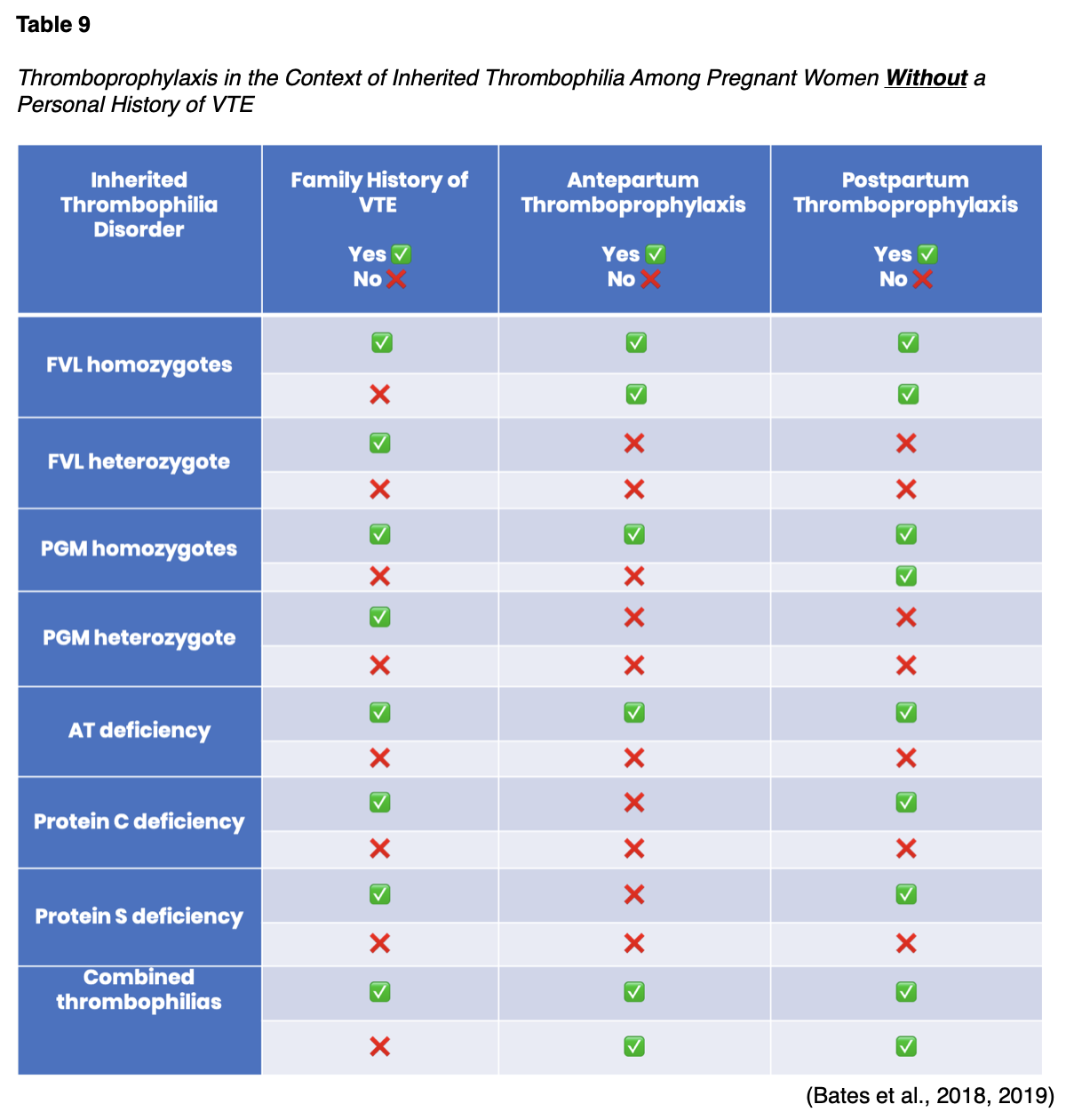 - In pregnant women with AT who have a positive family history of VTE, the ASH strongly recommends postpartum thromboprophylaxis (Bates et al., 2018, 2019, 2020).