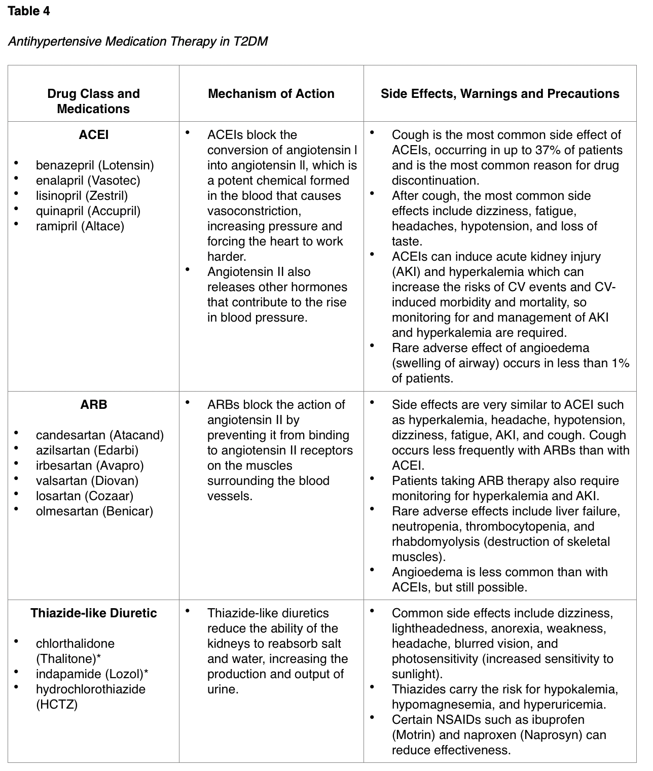 Treatment of hypertension to maintain the BP below 140/90 mmHg reduces CV events as well as microvascular complications in patients with T2DM. Several studies have demonstrated that antihypertensive therapy reduces ASCVD events, HF, and microvascular complications in patients with T2DM. Treatment should focus on controlling BP to achieve individualized targets utilizing drug classes demonstrated to reduce CV events, specifically in patients with T2DM. These agents include angiotensin-converting enzyme inhibitors (ACEIs), angiotensin II receptor blockers (ARBs), thiazide-like diuretics, or dihydropyridine calcium channel blockers (CCBs), as outlined in Table 4. ACEIs and ARBs are considered first-line antihypertensive agents in patients with T2DM, as they not only function to lower the blood pressure but also have an effect on reducing the risk of kidney dysfunction from microvascular complications. The ADA (2020) cautions that BP targets more aggressive than < 140/90 mmHg are not likely to improve CV outcomes among most patients with T2DM and are more likely to contribute to adverse effects and costs. Therefore, a balance between the potential benefits and risks must be considered prior to prescribing more intensive antihypertensive therapy (ADA, 2020).