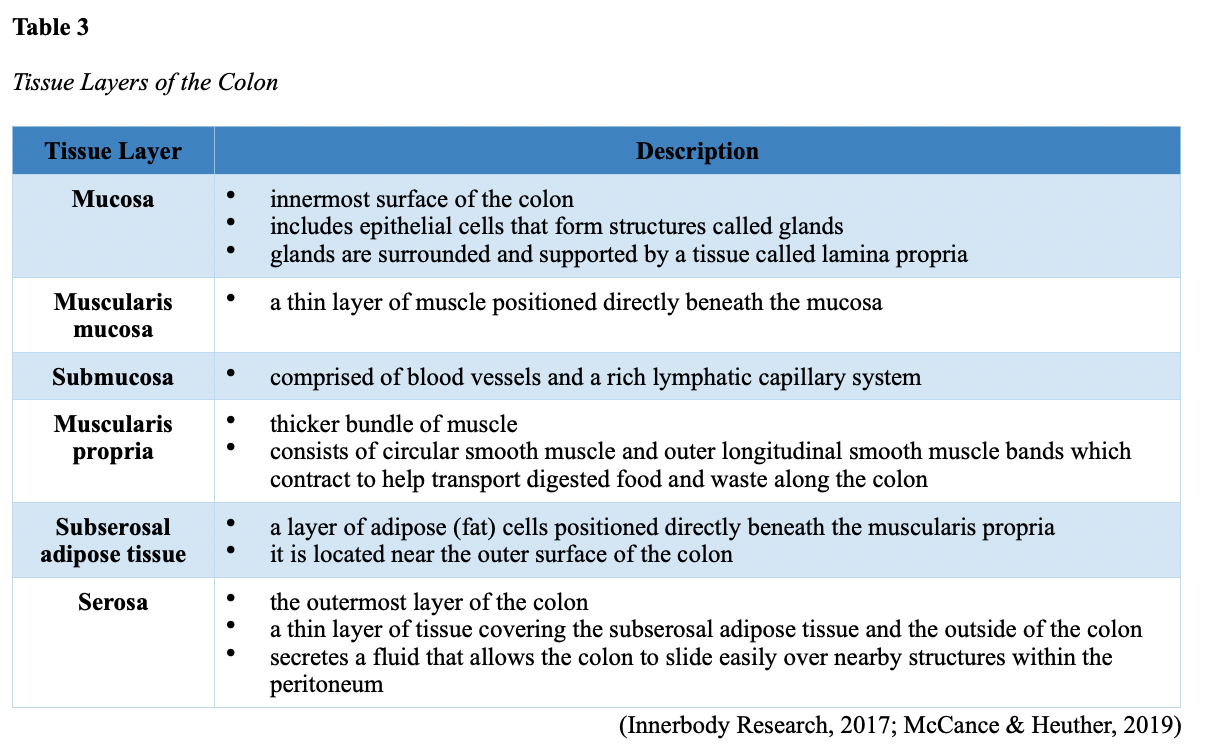 The six layers of tissue that comprise the colon wall are displayed in Figures 6 and 7 and then described below in Table 3.