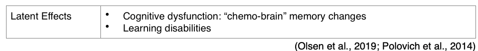 Since cancer cells divide rapidly, chemotherapy is primed to target cells that divide rapidly, thereby also impacting normal cells that divide quickly, such as the gastrointestinal (GI) tract, skin/hair cells, and bone marrow. This explains why the most common chemotherapy side effects include bone marrow suppression, nausea, vomiting, diarrhea, hair loss, and mucositis. Several chemotherapy agents have dose-limiting toxicities, which are severe toxicities and side effects during the therapy that are serious enough to lead to a reduction of the dose, or discontinuation of the treatment altogether. Dose-limiting toxicities require early recognition and intervention in order to minimize hospital admissions, readmissions, infections, and improve the patient’s survival. There is a large range of acute and long-term toxicities associated with chemotherapy agents and the comprehensive list extends well beyond the range of this module; however, the most common chemotherapy side effects will be discussed and are available for review in Table 2 (Itano, 2016).