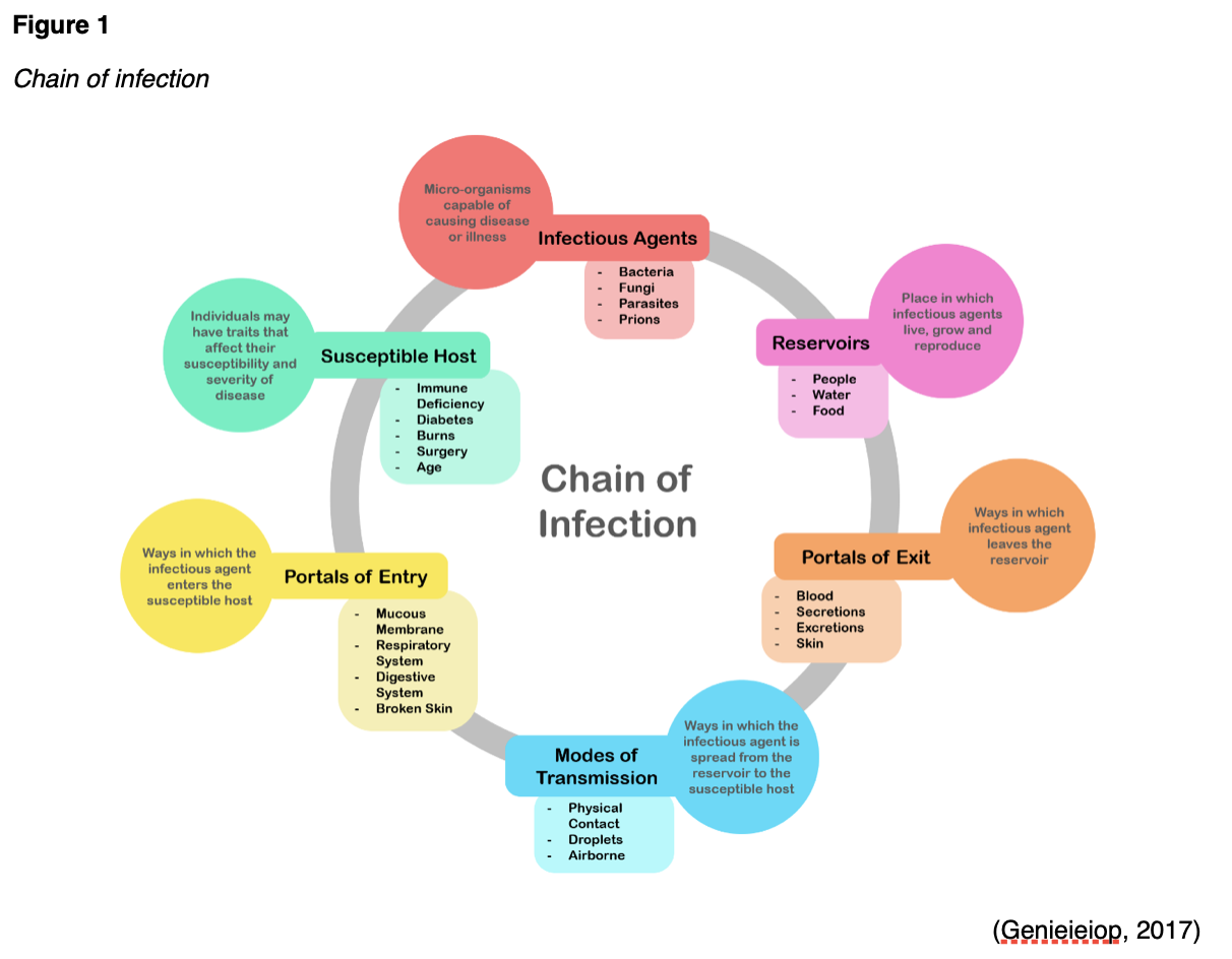 Genieieiop. (2017). 6 factors that influence the infectious agent in infecting a human body. [Image]. https://commons.wikimedia.org/wiki/File:Chain_of_Infection.png