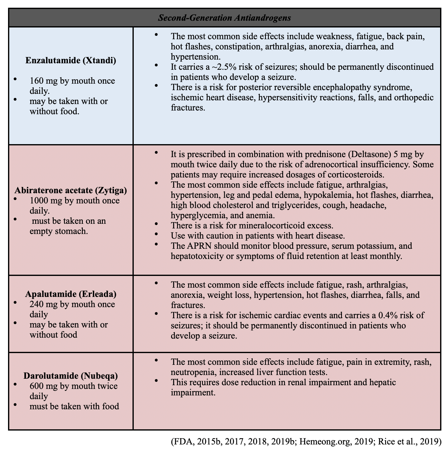 Antiandrogens are also called androgen receptor inhibitors or androgen receptor antagonists. These medications differ from LHRH antagonists by blocking particular facets of androgen signaling. They compete with androgens by binding to the AR. Testosterone circulates through the body but cannot interact with the prostate gland or promote cancer growth. Antiandrogens are oral medications that are rarely used as monotherapy since they do not block testosterone production. Instead, they are prescribed concurrently with LHRH agonists or in patients who have undergone a bilateral orchiectomy. This combined regimen is referred to as a combined androgen blockade. There are two major classes of antiandrogens; first-generation and second-generation. First-generation antiandrogens are credited with establishing the androgen receptor blockade as an effective treatment strategy in prostate cancer; however, they do not completely block all androgen receptor activity. These agents primarily block androgen production in the testes. First-generation antiandrogens currently approved for use in the US include bicalutamide (Casodex), flutamide (Eulexin), and nilutamide (Nilandron). Second-generation antiandrogens were developed to improve upon the mechanisms of first-generation drugs and in an attempt to bypass resistance to therapy. Second-generation agents have increased specificity and higher affinity for androgen receptors. Abiraterone acetate (Zytiga) was the first second-generation antiandrogen approved by the FDA in 2011. It is slightly different than others in the class as it works by preventing androgen biosynthesis and testosterone production in the testes, the adrenal glands, and the tumor. There are four second-generation antiandrogens currently approved by the FDA: enzalutamide (Xtandi), abiraterone acetate (Zytiga), apalutamide (Erleada), and darolutamide (Nubeqa). These agents are described in Table 7 (NCI, 2019; Rice et al., 2019).