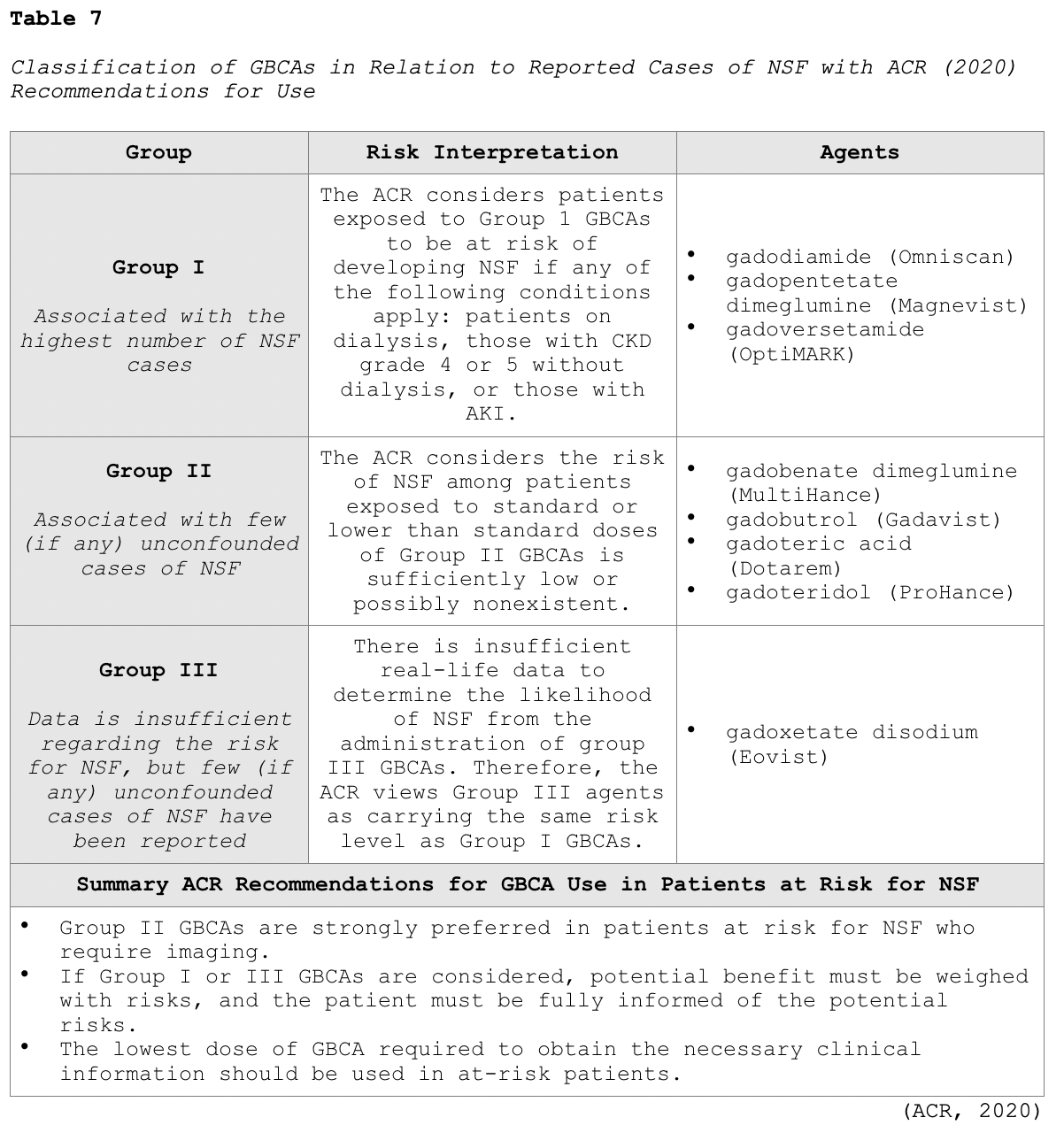 NSF is a rare but potentially life-threatening complication unique to GBCAs. It is a systemic condition characterized by thickening of the skin, organs, and other tissues in patients with severe preexisting renal disease. The initial symptoms typically include skin thickening and pruritus, which can then rapidly progress to contractures and joint immobility. In severe cases, the condition can be fatal. The time between GBCA administration and the onset of NSF is usually within days to months. However, there have been rare case reports of symptoms appearing years following the last GBCA exposure. NSF seems to have first appeared around 2000, but radiology guideline changes did not take place until 2006, at which time clinicians began to withhold GBCAs in patients with AKI or severe CKD when the GFR is <30mL/min/1.73m2. While this led to a decline in the incidence of NSF cases, further investigation demonstrated the risk for NSF was higher in specific types of GBCAs. As a result, modern-day radiology algorithms group GBCAs based on their reported associations with NSF in vulnerable patient populations, as outlined in Table 7 (ACR, 2020).