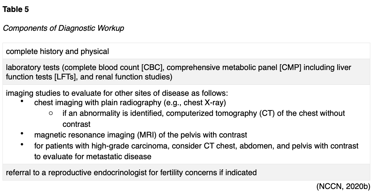 Once EC is diagnosed, the NCCN (2020b) guidelines endorse the diagnostic workup components as outlined in Table 5.